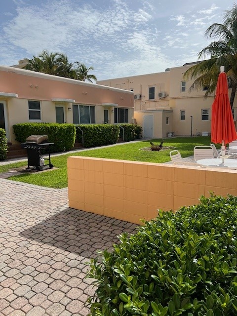 The complex features a private heated pool surrounded by lounge chairs and umbrellas, a shaded courtyard with a barbecue grill and outdoor dining, and free dedicated parking for every unit. Each condo comes equipped with a full kitchen, in-unit washer and dryer, Wi-Fi, and all the beach essentials — chairs, towels, and umbrellas — so you can walk out the door and be on the sand in under a minute.